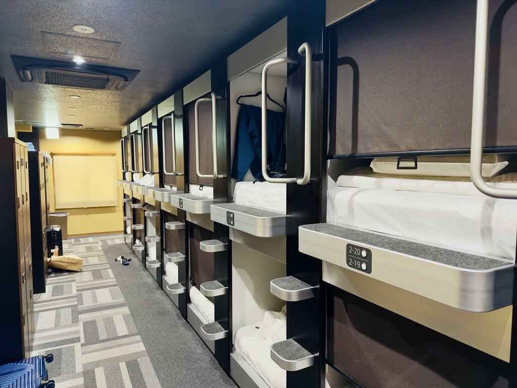 숙소 구조는 전형적인 캡슐 호텔 형태였다. 개인이 사용할 수 있는 캡슐 공간이 마련되어 있고, 별도로 열쇠가 달린 개인 사물함이 제공되는 방식이었다. 캡슐 내부는 아주 넓지는 않았지만, 잠을 자기에는 충분한 공간이었고, 침구 상태도 비교적 깔끔한 편이었다.