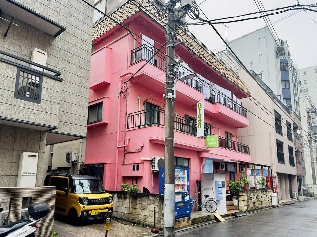 우에노역에서 숙소 방향으로 걸어가다 보면, 멀리서부터 유독 눈에 띄는 핑크색 건물이 보인다. 이곳이 바로 이번에 묵게 된 그린 호텔이었다. 이름과 전혀 다른 외관 색상 덕분에, 처음 찾는 사람이라도 길을 헤맬 일은 없을 것 같다는 생각이 들었다.