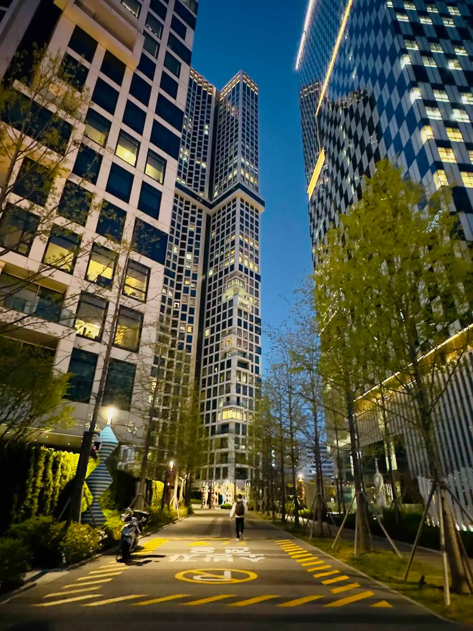 고층 건물의 차가운 외관과 달리, 지면 가까이에서는 비교적 따뜻한 색감의 조명이 사용된다. 나무와 식재를 따라 배치된 조경 조명은 공간의 온도를 조절하며, 도시의 스케일과 일상의 감각 사이를 자연스럽게 연결한다. 위로는 도시의 위용을, 아래로는 생활의 안정을 전달하는 구성이다.