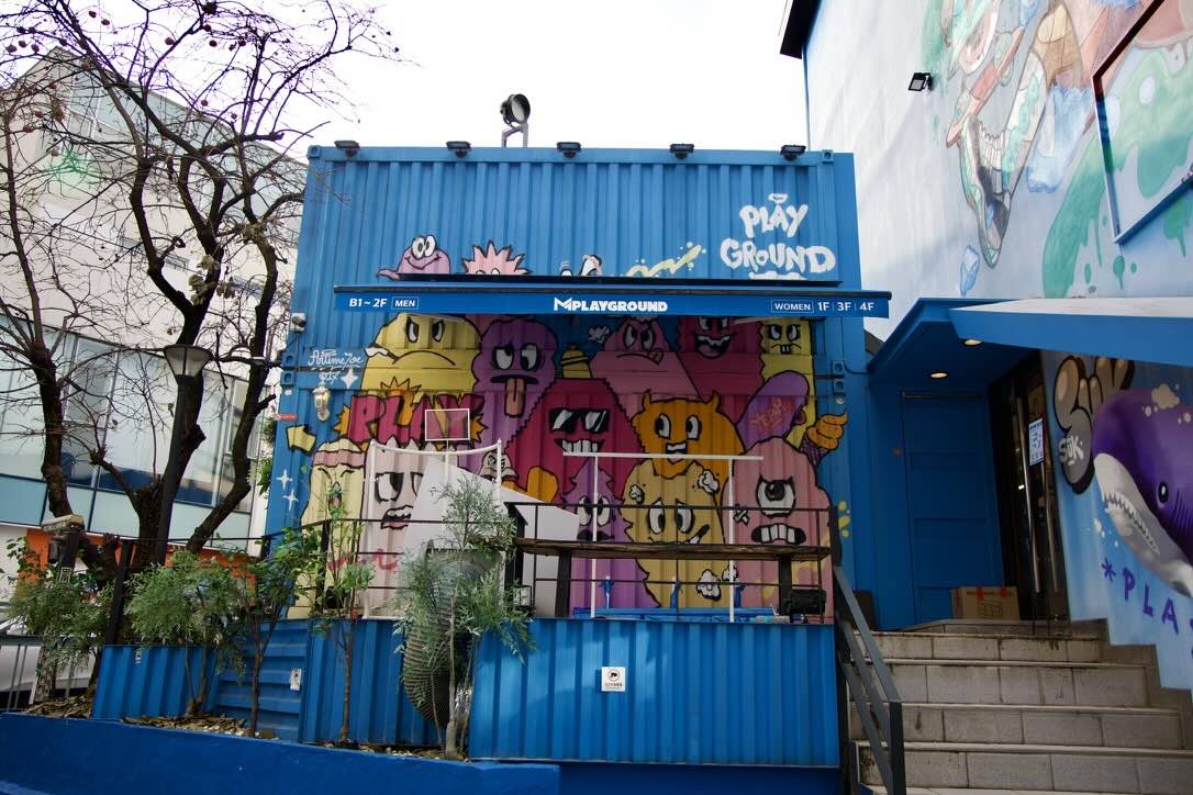 홍대 레드로드를 걷다 보면, 자연스럽게 시선이 멈추는 건 건물 자체다. 화려하게 꾸민 간판보다, 오래된 외벽 위에 덧입혀진 그래피티가 먼저 눈에 들어온다. 온맘씨어터가 자리한 이 건물 역시 마찬가지다. 바로 옆 플레이그라운드 건물과 이어지는 이 일대는, 홍대 특유의 자유로운 에너지가 가장 노골적으로 드러나는 구간이다. 아침 시간대의 레드로드는 비교적 조용하지만, 그래피티는 그 조용함과는 어울리지 않게 또렷하다. 밤의 소음과 사람들의 움직임이 벽면에 그대로 남아 있는 듯한 느낌이다.