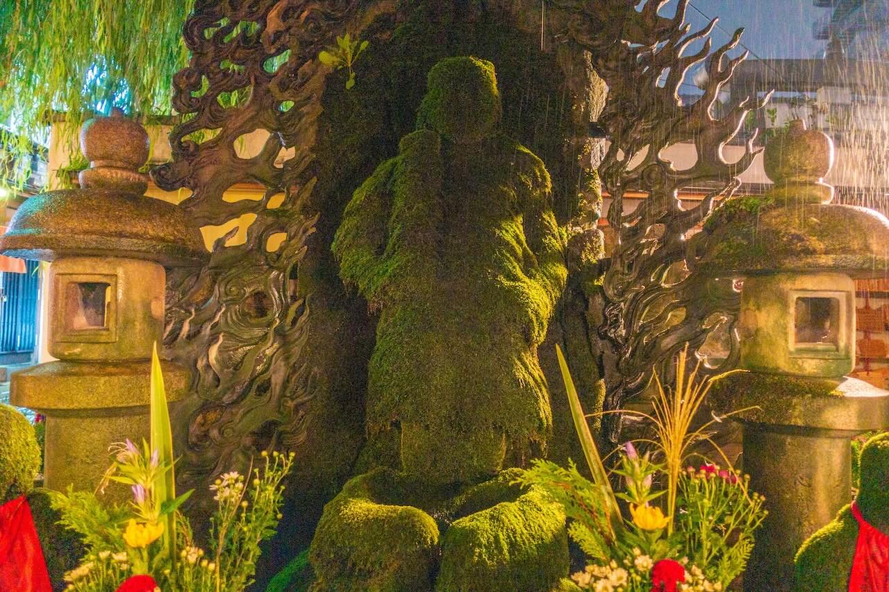 이 불상은 부동명왕상(不動明王像)이다. 현지에서는 ‘미즈카케 후도(みずかけ不動)’라고 부른다. 직역하면 “물을 끼얹는 부동명왕”이라는 뜻이다. 불상 전체가 이끼로 덮여 있는 이유는 단순하다. 사람들이 계속 물을 끼얹기 때문이다.