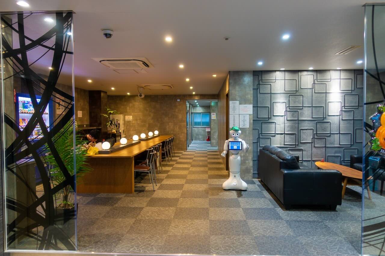 가격이 매우 저렴했기 때문에 시설은 크게 기대하지 않았다. 하지만 막상 들어가보니 생각보다 깔끔한 편이었다. 1층 로비는 일반 비즈니스 호텔처럼 꾸며져 있었고, 자판기와 간단한 휴식 공간이 마련되어 있었다. 작은 안내 로봇이 서 있던 것도 인상적이었다.