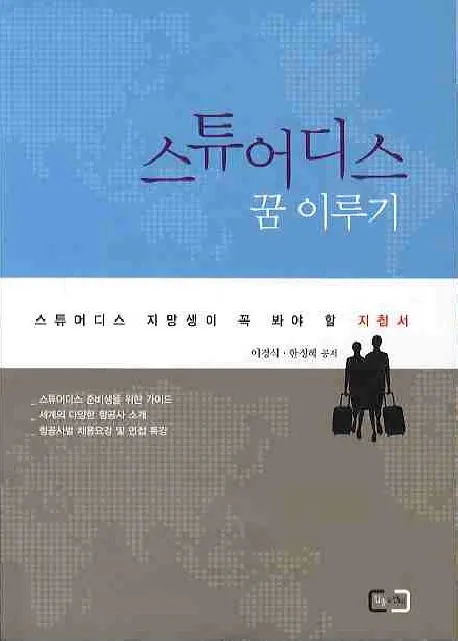 “스튜어디스 꿈 이루기 : 스튜어디스 지망생이 꼭 봐야 할 지침서”라는 제목의 책은 승무원이 되는 방법에 대해서 정리하고 있는 “교과서”와 같은 느낌의 책이다. 승무원 교재로 사용해도 손색이 없을 것 같은 느낌으로 기본에 충실하고 있다.