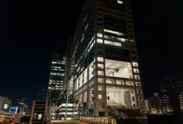 다리에서 옆 방향을 바라보면 개방된 구조의 독특한 건물이 보이는데, 바로 후지 TV 본사 건물이다. 처음 ...